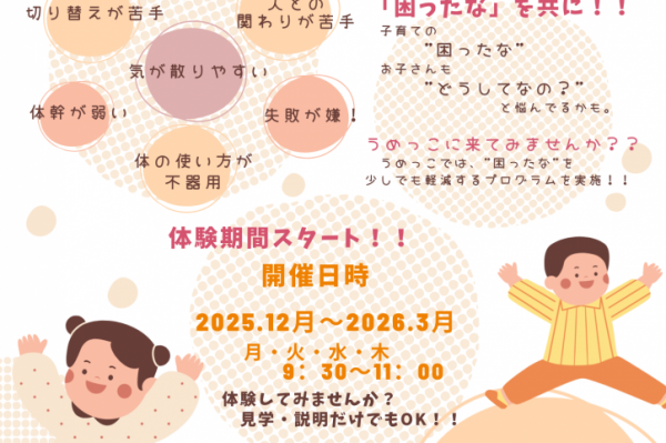 利用に際して療育手帳や身体障害者手帳は必須ではないため、発達の遅れや偏りにより日常生活に困難さを抱えているお子様も利用しやすいという利点があります。