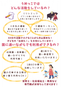 うめっこでは、そんなお子様の育ちのお悩みに寄り添いながら、成長に向けた支援を行います!
